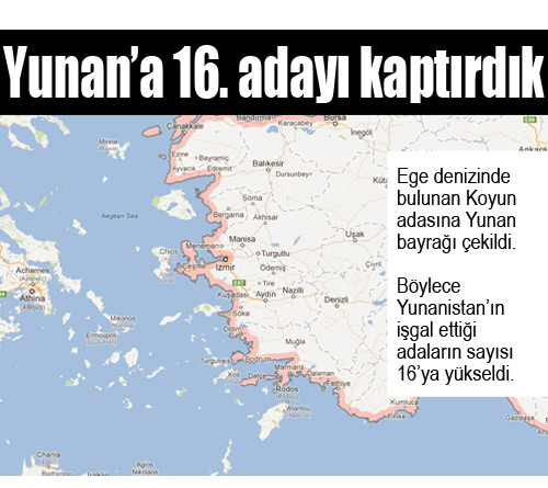 Yunanistan’ın işgal ettiği adalarımızın sayısı Koyun Adası ile 16’ya ulaştı. Ege Denizi’nde Koyun, Hurşit, Fornoz, Eşek, Nergizçik, Bulamaç, Kololimnoz, Keçi, Sakarcılar, Koçbaba, Ardacık, Akdeniz’de ise Gavdos, Dhia, Dionisades, Gaidhouronisi ve Koufonisi işgal altında.