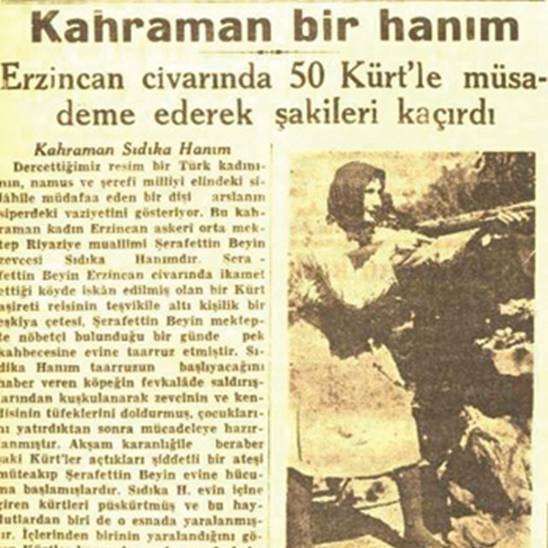 “Dercettiğimiz (yayınladığımız) resim, bir Türk kadınının namus ve şerefi milliyi elindeki silahıyla müdafaa eden bir dişi aslanın siperdeki vaziyetini gösteriyor. Bu kahraman kadın, Erzincan Askeri Orta Mektep Riyaziye (matematik) muallimi Şerafettin Bey’in zevcesi(eşi) Sıdıka Hanım’dır. Şerafettin Bey’in Erzincan yakınlarında ikamet ettiği köyde iskân edilmişi bir Kürt aşireti reisinin teşvikiyle 6 kişilik bir eşkıya çetesi, Şerafettin Bey’in mektepte nöbetçi bulunduğu bir günde pek kahpecesine evine taarruz (saldırı) etmişlerdir. Sıdıka Hanım, taarruzun başlayacağını haber veren köpeğin fevkalade saldırılarından kuşkulanarak zevcinin (kocasının) ve kendisinin tüfeklerini doldurmuş, çocuklarını yatırdıktan sonra mücadeleye hazırlanmıştır. Akşam karanlığıyla beraber, şaki Kürtler açtıkları şiddetli bir ateşi müteakip (Sıra ile birbiri arkasından gelen) Şerafettin Bey’in evine hücuma başlamışlardır. Sıdıka Hanım, evin içine giren Kürtleri püskürtmüş ve bu haydutlardan biri de bu esnada yaralanmıştır. İçlerinden birinin yaralandığını gören Kürtler kaçmışlar. Bu sırada bahçeye kadar çıkan Sıdıka Hanım, 58 fişek yakmıştır. Şerafettin Bey, vakadan (olaydan) haber alarak köye geldiği zaman kahpe şakiler Dersim Vilayeti hududuna kadar kaçmış bulunuyorlardı.