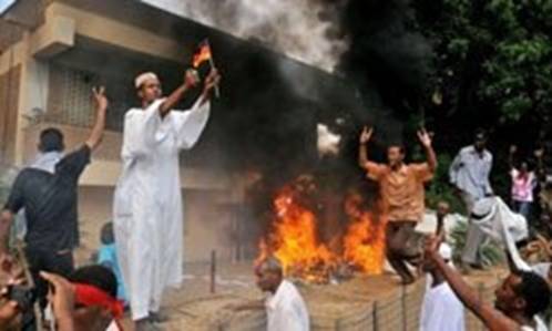 Başkent Hartum’da 5 bin kişilik öfkeli kalabalık, aynı bölgede bulunan İngiliz ve Alman elçiliklerine saldırdı. Polis protestocuları göz yaşartıcı bomba ile etkisiz hale getirmeye çalıştı.