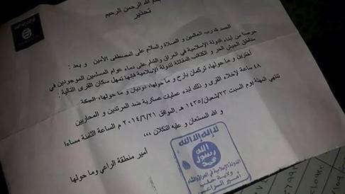 Geçen hafta itibariyle 100 Türkmen köyünü kontrolü altına alan IŞİD, İslamiyet adına yaptığı vahşi eylemleri bu sefer Türkmen halkına yapmaya başladı. Türkmenlerin elindeyse sadece 41 köy kaldı. Köylüler IŞİD’in her an köylerine gireceği korkusuyla bekliyorlar. 26 Haziran günü IŞİD, bazı Türkmen köylerinin boşaltılması için bir yazı gönderdi.