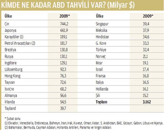 ABD Hazinesi, kurtarma paketlerinin maliyetiyle bütçedeki açık büyüdükçe daha fazla tahvil ihraç ediyor. Ettikçe de karşılığını görüyor. Dünya çıkardığı tahvillere ilgi göstererek ABD’yi finanse etmeye devam ediyor. En başta Çin var. Eylül 2008’e kadar lider Japonya idi. Çin’in alımlarındaki hızlı artış sebebiyle Japonya ikinci sıraya gerilemiş. Şu an Çin kamu ve özel kesiminin elinde tuttuğu ABD Hazine kâğıtlarının tutarı 744,2 milyar dolar.