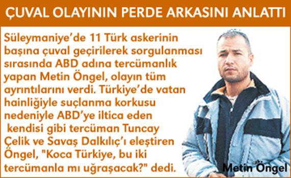 Kuzey Irak’ta, 11 Türk askerinin ABD askerleri tarafından gözaltına alınıp başlarına çuval geçirilerek alıkonulması olayının bilinmeyen bir tanığı ortaya çıktı. O dönemde Amerika Birleşik Devletleri adına tercümanlık yapan 32 yaşındaki Metin Öngel, 4 Temmuz 2003 günü yaşananları tüm ayrıntılarıyla ilk kez Hürriyet’e anlattı.