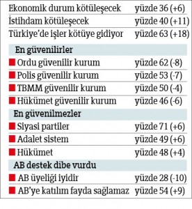 Avrupa Birliği’nin kamuoyu araştırmalarından sorumlu birimi Eurobarometer tarafından hazırlanan bir çalışma Türkiye’de önümüzdeki bir yıla olumsuz bakıldığını, hükümete güvenmeyenlerin oranının güvenenleri geçtiğini, AB üyeliğine verilen desteğin ise dibe vurduğunu gösteriyor.