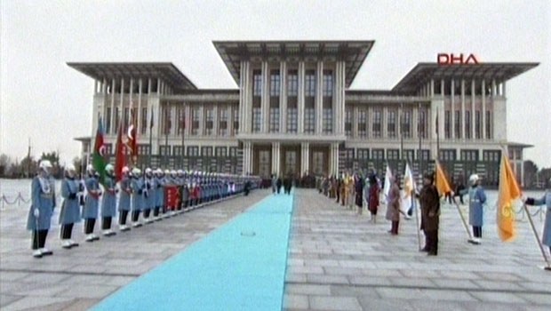 Azerbaycan Cumhurbaşkanı İlham Aliyev’in karşılama töreninde, 16 Türk devletinin askerleri bu kez dışarıda yerlerini aldılar.