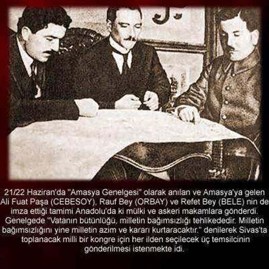 Mustafa Kemal ve arkadaşları, 12 Haziran 1919’da Amasya’ya geçtiler. Milli Mücadele çalışmalarını sürdüren Mustafa Kemal, Hüseyin Rauf Orbay, Refet Bele ve Ali Fuat Cebesoy birlikte Amasya Genelgesi’ni hazırladılar. Hazırlanan bildiri, Erzurum’da 15. Kolordu Komutanı Kazım Karabekir’e sunuldu. O’nun da onayının alınmasından sonra bildiri, 22 Haziran 1919’da tüm mülki amir ve askeri komutanlara telgrafla Abdurrahman Rahmi Efendi tarafından ulaştırıldı.
