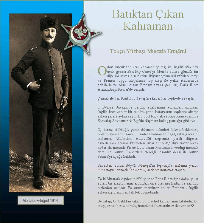 Şimdi okuyacağınız öykü, dört sahra topu ile dünyada bir uçak gemisini batıran ilk askerin, Topçu Mülazım (Teğmen) Mustafa Ertuğrul’un öyküsüdür…