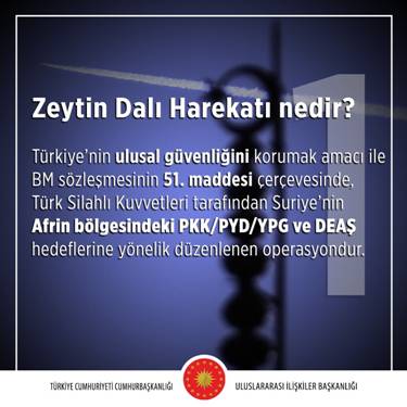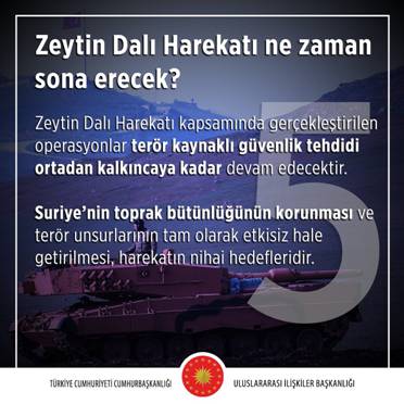 Cumhurbaşkanlığı, sosyal paylaşım sitesi Twitter’daki hesaplarından “Zeytin Dalı Harekatı”na ilişkin 10 soruyu cevaplayan bilgi kartları yayınladı.