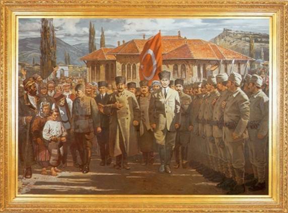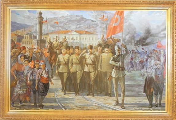 Bu tabloda, 9 Eylül 1922’de İzmir’in kurtuluşundan sonra, Başkomutan Gazi Mustafa Kemal Paşa ve yakın silah arkadaşlarıyla birlikte Türk ordusunun halkın coşkun gösterileri arasında İzmir’e girişi anlatılmaktadır. Geri planda ise İzmir Hükümet Konağından Yunan bayrağının indirilerek Türk bayrağının göndere çekilişi ve İzmir şehrinin alevler içinde yanışı resmedilmiştir.