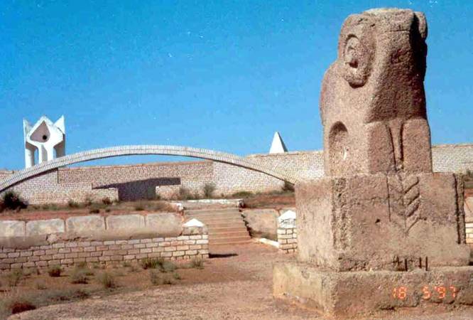 Koç heykeli ve Korkut Ata’nın mezarı. Korkut Ata’nın mezarını sel götürmüş, ancak halk kopuzun altında olduğuna inanılıyor. Yusalı/Kazakistan