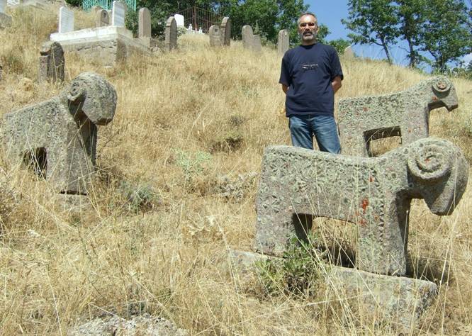 Mustafa Aksoy, Sağlamtaş köyünün mezarlığında. Buradaki bazı koç başlı mezarların tarihleri bilinmiyor. Ancak köy halkı mezarlıktaki koç başlı mezarların atalarının dan kalan tarihi miras olduğunu biliyorlar. Pülümür/Tunceli
