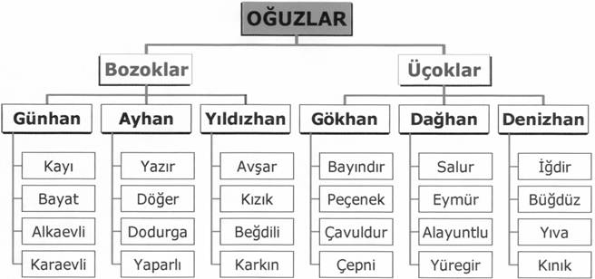 İlk zamanlar Üçok ve Bozok adlarıyla iki ana kola ayrılmış olan Oğuzlar, daha sonraki devirlerde, Dokuz Oğuz, Altı Oğuz, Üç Oğuz adlarında boylara da ayrıldılar. Oğuzlar, yirmi dört boydan meydana gelmişti. Bunlardan on ikisi Bozok, on ikisi Üçok koluna bağlıydı. Tarihçiler, hazırladıkları cetvellerde Oğuz boylarının adlarını, sembollerini ve ongunlarını (armalarını) göstermişlerdir.