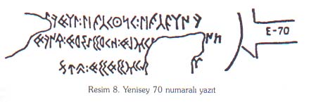 Üçüncü bir metin, Yenisey 70 numaralı metindir. Ben kitabımda yayınladım onu. Harflerin bazılarını ters çevirip yazıyor, o zaman kelimeyi anlayamıyorsunuz. Aynalı yazı olduğunu anladığınızda, o şifreyi çözdüğünüzde fevkalade güzel bir anlam çıkıyor.