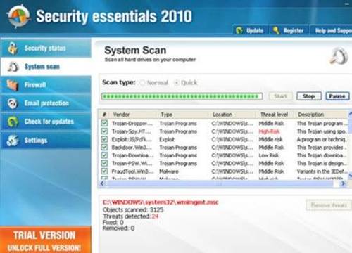 “Security Essentials 2010” ismini taşıyan ve logo olarak Windows’un logosunu kullanan bu sahte yazılım, kendini başarıyla gizliyor. İsim benzerliğini kullanarak kullanıcıların bilgisayarına sızmaya çalışan bu sahte güvenlik programının aslında kendisi bir virüs ve kullanıcıların dosyalarına virüs bulaştırabiliyor, hatta silebiliyor.