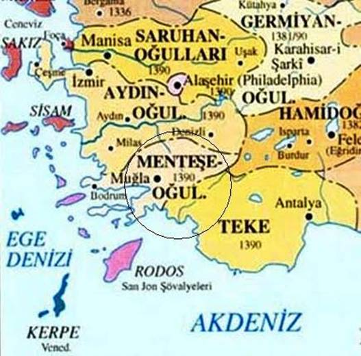 XIII. Yüzyılın sonlarına doğru mevcudiyetini gördüğümüz Menteşe Beyliği’nin bu suretle, yani uçtaki Türklerin batıya doğru yayılmalariyle mi yoksa güneyden Akdeniz yoluyla mı eski Karya kıt’asına yerleştikleri henüz sarih olarak bilinmemekte, bazı kayıtlar ikinci şıkkı tercih ettirmektedir. Bu asrın ikinci yarısı içinde Karya’ya. Menteşe ili denildiği malûm olmaktadır.