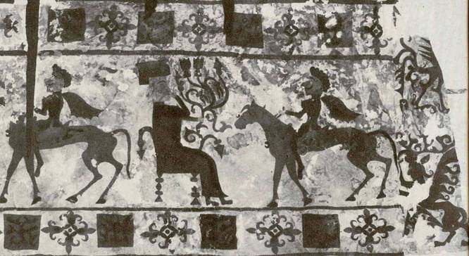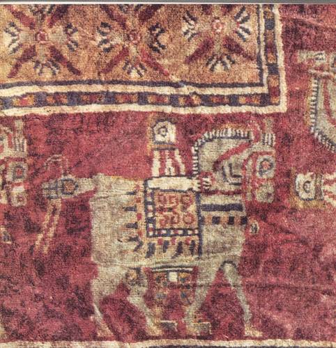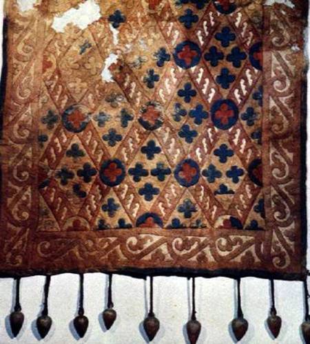 Pazırık halısında bir detay, damganın adını Hun gülü ve atın eyerindeki koç başı damgaları.