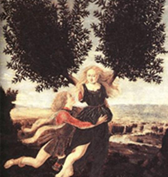 Bir gün Apollon, kıyıları ağaçlarla gölgelenen ırmağın kenarında güzel bir genç kız görür. Orontes’in (Günümüzde Asi olarak bilinen, Türkiye’nin Antakya şehrinin ortasından geçerek Akdeniz’e dökülen nehir) kızı olan bu güzel su perisinin adı Daphne idi ve Apollon, görür görmez ona aşık olmuştu. Daphne, ormanın derinliklerinde dolaşmaktan zevk alırdı. Ay ışığında yabani hayvanları kovalamak, avlamak en büyük eğlencesi idi. Yalnız başına dolaşmayı çok severdi. Dahası Daphne, hayatı boyunca yalnız ve bakire olarak yaşamaya yemin etmişti. Erkeklerden nefret ediyordu. Bu yüzden evlenmeyi kesinlikle istemiyordu. Fakat Apollon ona delicesine tutulmuş peşini bırakmıyordu. Ormanda karşılaştıklarında Apollon, güzeller güzeli bu kızla konuşmak ister ancak Daphne ondan korkarak koşmaya başlar. Apollon ne dese onu durmaya ikna edemez, Daphne korkmuştur bir kere. Yorgun düşene kadar koşar koşar koşar. Daha fazla koşacak gücü kalmadığında yere yıkılır ve toprak anaya yalvarmaya başlar. “Ey toprak ana beni ört, beni sakla, kurtar” Toprak ana onun yakarışını duymuştur. Az sonra Daphne, yorgunluktan ağrıyan bacaklarının sertleştiğini, odunlaşmaya başladığını hisseder. Gri renk bir kabuk göğsünü kaplar. Güzel kokulu saçları yapraklara dönüşür ve kolları dallar halinde uzanır, küçük ayakları ise kök olup toprağın derinliklerine doğru iner. Apollon, sevdiği kıza sarılmak isterken Defne ağacına çarpınca şaşırır.
