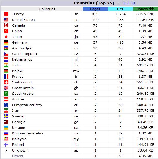 Sitemizin Ülkelere göre; Aralık 2010 izlenme cetveli şöyledir: