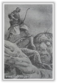 2-“Ak-Kübek dağdan yuvarlanan kayaları, başı ile vurarak yeniden dağın doruğuna fırlatır. Salur Kazan da aynı şeyleri yapar.”