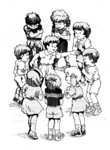 “Ebe ebe nerede, su doldurur derede, dere boyu çalılık, şu ebe ne de alık, ebe suya dalamaz, araba da bulamaz, ene mene dostum, ben sana küstüm, armudu kestim, tavana astım, tap dedi düştü, kargalar üşüştü, bu da bana düştü.”(Şimşek, 2002: 45).