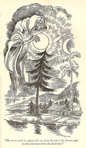 Ay ve güneş, Vainamöinen’in şarkısını dinlemek için yere inerler. Pohjola’nın kadını, her ikisini de yakalar ve bir dağın içine saklar.