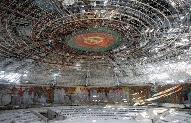 Duvarlarında Sovyet ve Bulgar tarihini anlatan çeşitli resimler bulunan yapının çatısı bakırdan yapılmış ve zamanla bu değerli maden sökülüp çalındıkça bina da soğuk kış şartlarının insafına bırakılmış.