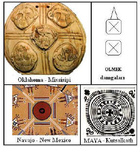 Yandaki şekilde Anadolu Çatalhöyük bölgesinde bulunan bir Hitit tapınak duvarındaki Tengri damgaları görülüyor. İlk yazıda Amerika halklarının ürettikleri Tengri simgelerinden örnekler sundum. Hem kuzey Amerika halkları, hem de orta ve Güney Amerika halklarında Tengri simgelerini bulmak mümkündür. Maya kültüründe daire içindeki artı (+) işareti hem dört yönü hem de yönetici kutsal kişiyi simgeler. Böylece “dört yöne hakim olan yönetici” kavramı ortaya çıkar.
