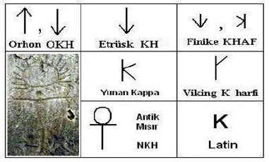 Şekilde bu değişim görülmektedir. Etrüsk yazısında (M.Ö: 600 ile M.S. 100 yıllarında) aşağı doğru yönelmiş olan ok görüntüsü aynen kalmıştır. Resmin sol alt köşesinde görülen kaya resmi kollarını iki yana açmış insan ve başı üzerinde bir güneş görülüyor. Kaya resmi İsviçre Alplerinin güney yüzündeki Valcomanica bölgesinde bulunuyor. Orası halen kuzey İtalya olup Etrüsk halkının ilk yerleşim bölgesidir. Soldaki kaya resmi doğrudan Tengri damgasını çağrıştırıyor ve Ön-Türk kökenli olduğuna işaret ediyor. İnsan yönetici ve tanrısal özelliklere sahip OKH olmaktadır. Bu resimle antik Mısır ANKH arasındaki hem ses hem şekil benzerliği çarpıcıdır.