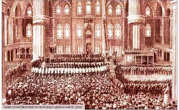 Sultan Ahmed Câmiindeki bir mevlid alayını gösteren eski bir gravür.