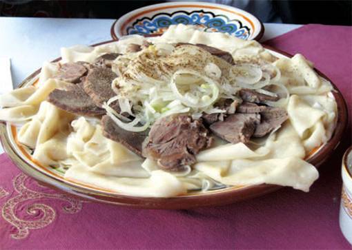 Bir başka ünlü yemek olan Lagman, tel tel hamurlu, sulu bir et yemeği. Kuyruk yağı, lâhana, soğan, patates, biber, havuç, domates, sarmısak gibi malzemeler içeriyor. Hayli yaygın bir diğer yemek olan kavurdak için kuşbaşı doğranan etler, karaciğer, böbrek ve yürek de dahil olmak üzere, önce yağda kızartılıyor. sonra da su ilave edilip yumuşayıncaya kadar pişiriliyor. Saygın konuklara ikram edilen miypalav ise, koyun kellesi. Kulaklar hariç tüm deri, çene etleri, gözler, beyin, kuyruk yağı ve karaciğer birlikte iyice eziliyor, soğan, karabiber ve tuz ilave edilerek karıştırılıyor. Bujı da bizim mumbar dolmamız. Koyunun eti, iç yağı, karaciğeri çok küçük doğranıyor, içine buğday unu, sarmısak, karabiber, tuz katılıp karıştırılıyor. Bu karışım bir ucu kapatılmış kör bağırsağın içine doldurulup diğer ucu dikiliyor ve suda kaynatılıyor.