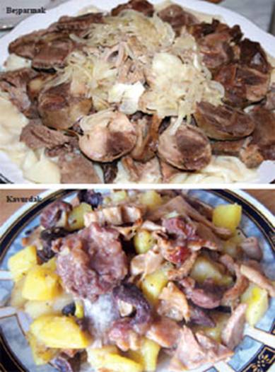 Et, çoğunlukla haşlanıp yeniyor ama, iştah açıcı giriş yemekleri olarak da karşımıza çıkıyor. Bizim sucuğun benzerlerini Kazakistan’da, “sujuk”, “karta”, “kazkarta”, “kazı” gibi adlarla görüyoruz. Sofraların kıymetlisi olan kazkarta atın kaburga etlerinden yapılıyor, sarmısak, tuz ve biberle harmanlanıp bağırsaklara dolduruluyor. Çok lezzetli bir kurutulmuş et olan “sur et” ise her mevsimde tüketilebilir. Davetlerin ana yemeğinin adı: “beşparmak”. Geleneksel olarak elle yendiği için bu ad verilmiş. Kemikli et, kuru soğan, un ve yumurta ile yapılan yemeğin haşlama suyuna tane zencefil, patates ve havuç ilave edilebiliyor. İrice parçalanmış etler haşlanırken bildiğimiz mantı hamuru hazırlanıyor. İnce açılmış hamur dörtgen parçalar halinde kesiliyor. Etler tencereden çıkartılıp hamurlar et suyunda haşlanıyor. Bir tarafta da küçük bir miktar et suyunda soğanlar hafifçe yumuşatılıyor. Servis tabağına önce hamurlar yerleştiriliyor, üzerine etler, en üste ise soğanlar.