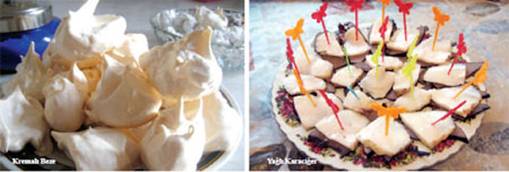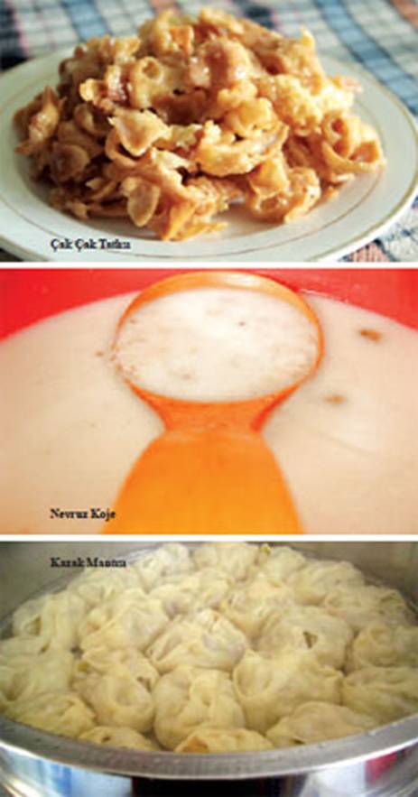 Bayramlarda ve özel günlerde, yağda kızartılmış mayalı hamurdan yuvarlak ya da kare biçiminde yapılan, yumuşacık, tuzlu “bavursak“ ve “çelpek” sofranın baş tacı. Biraz bizim pişiyi andırıyor. Mantı başta olmak üzere hamur işleri de sofraların vazgeçilmezi. Kıymalı Kazak mantısı, bizim mantılara göre hayli iri, bohça biçiminde ve çok katlı özel bir tenceresi var: en alttakinde su kaynıyor, diğer tencerelerin altları delikli ve mantılar buharda pişiyor. Ekmek sofranın demirbaşlarından, aynı şey pilav için de geçerli. Pilav, kuru kayısı, üzüm ve erikten havuç, soğan ve ete kadar pek çok malzeme ile yapılıyor.