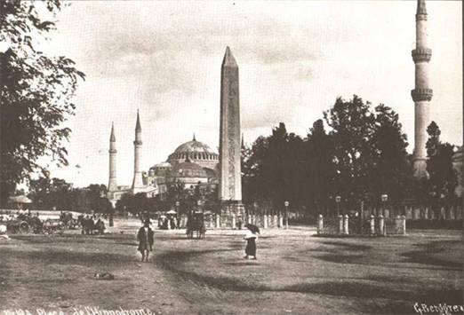 Sultanahmet Meydanı’nın dikili taşları ile bir odak oluşturması söz konusudur. Bizans döneminde Konstantin formu olarak adlandırılan bu alan, Osmanlı döneminde At Meydanı adını almıştır. Bu gravür, 19. yüzyılda Thomas Allom tarafından yapılmıştır.