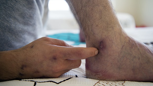 H.Z. eroin bağımlısı. Kollarında damar kalmamış. Damar bulamadığı için eroini artık ayaklarına enjekte etmeye başlamış. 21 gündür içmiyor. Yine de yaralar bu halde.