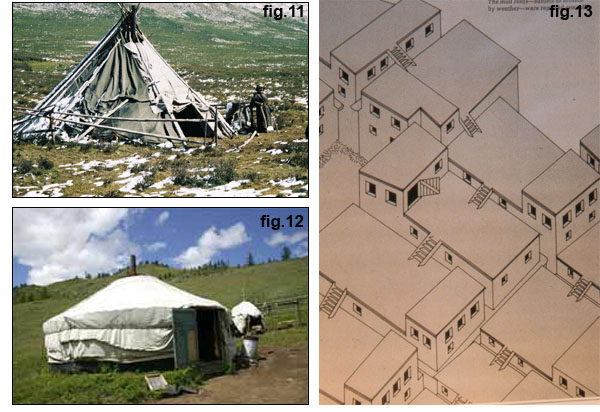 Aşağıdaki Türk mekanlarını Amerikan Kızılderili mekanlarıyla karşılaştırınız. Navajo çadırlarının (hogan – yurt) deriden yapılmadığı dikkatinizi çekmiş olabilir. Bunun sebebi esas Navajo göçmenlerinin hayvancılıkları yoktu.