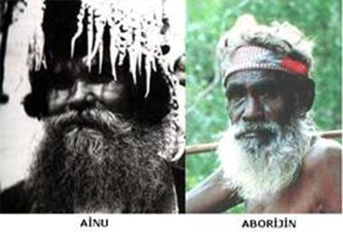 Bu guruplardan bir tanesi kuzey Japonya adalarında yaşamlarını sürdürmeye çalışan Ainu halkı, diğeri Avustralya’nın orta bölgelerinde az sayıda kalmış olan Aborijin adıyla anılan yerli halk. Üstteki resimde bu iki halktan birer örnek kişi görülüyor. Aralarındaki uzak mesafeye rağmen yüz hatlarındaki benzerlik çarpıcıdır. (Soldaki resmin kaynağı: AİNU Spirit of the North People, University of Washington Press, 1999, ABD. Sağdaki resmin kaynağı: National Geographic, Şubat 1988, Cilt 173, sayı 2, sayfa 266)