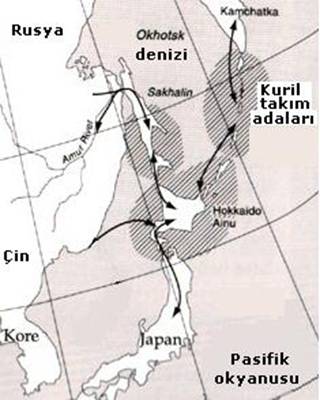 Üstteki genetik dağılım haritasında Orta Asya halkı ile tüm doğu ve güney-doğu Asya halkının ortak bir genetik havuzdan türemiş olduğunu görmekteyiz. Kuzey- doğu Asya halkı ile kuzey Amerika halkı arasında da yakın genetik ilişkiler bulunmuştur. Bu sonuçlar bir önceki yazımda belirttiğim dağılım modelini desteklemektedirler. Ainu dilinin Asya kökenli bitişken bir dil olduğu saptanmıştır. Ayrıca, Türkçe ile ilişkili sözcüklere de rastlamak mümkündür. Ainu halkının yaygın yerleşim bölgesini alttaki haritada görmekteyiz. Haritada Ainu halkının Asya kıtasından Sahalin, Kuril ve Hokkaido adalarına göç yolları gösterilmiştir. Taralı bölgede halen yaşayan Ainu’lar vardır.