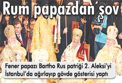 Fener Papazı Bartholomeos, Avrupa ve ABD’nin şımartmalarıyla ekümeniklik iddiasına adım adım yaklaşıyor. İstanbul’da Ortodoks Zirvesi düzenleyen Barthalomeos, en büyük rakibi Rus Patriği 2. Aleksi’nin de İstanbul’a gelmesiyle adeta şov yaptı. 2008’in ’Aziz Pavlos Yılı’ilan edilmesi nedeniyle İstanbul’da bulunan dünyanın çeşitli ülkelerinden 16 patrik, Fener Rum Patrikhanesi tarafından Aya Yorgi Kilisesi’nde düzenlenen ayine katıldı. 2,5 saat süren ayin sırasında Dini Meclis (Sensinod) Başkatibi El Pidoforis tarafından 10 Ekim’de başlayan ve iki gün süren, toplantıda alınan kararların yer aldığı bildiri okundu.