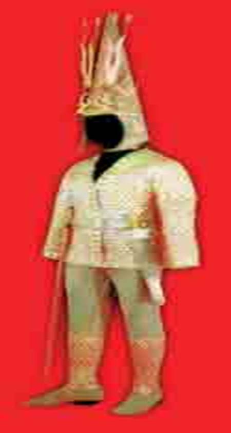 Altın elbisenin başlığı ok ve tuğlarla süslü. Alın hizasında koç, geyik ve at kabartmaları var. Bu kabartmalara, kama kılıfında ve öteki eşyalarda da rastlanıyor. Belindeki kemerin solunda bir kılıç, sağında ise bir kama asılı. Ceketin altındaki düz pantolonun paçaları çizmenin içine giriyor. Ceket, yüzlerce üçgen altının birleştirilmesinden meydana gelmiş, çorabın çizme ile diz kemiği arasında kalan kısmında yine üçgen parçalar, çizmede ise dörtgen parçalar var.