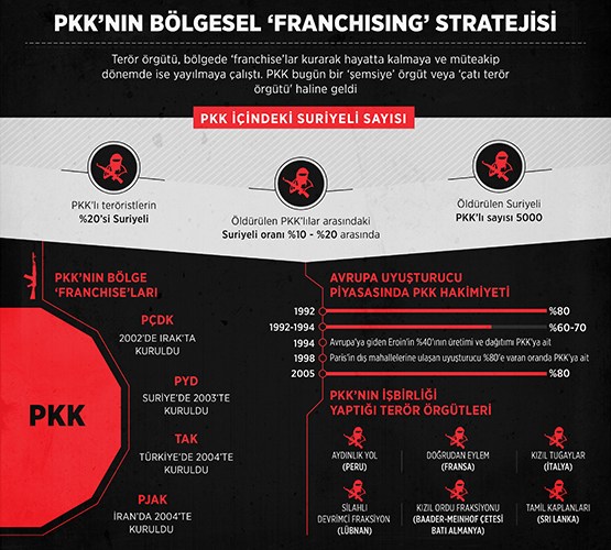 Suriye’deki devrim hareketlerinin bölgesel ve uluslararası anti-devrim güçleri tarafından önce iç savaşa evrilmesi, ardından DEAŞ’la terörle mücadele eksenine indirgenmesi neticesinde, PKK’nın ‘franchising’ yapılanması başka bir boyuta taşındı. DEAŞ’ın Ayn el-Arab saldırısından sonra ortaya çıkan ‘Rojava devrimi’ söylemi ve buna eşlik eden ‘demokratik otonomi’ ve ‘demokratik konfederalizm’ kavramları, geçmişte her zaman birlik içinde olmadığı DHKP-C ve MLKP gibi marjinal sol terör örgütlerinin bile PKK’nın yanında yer almalarına, onun ‘franchise’ları haline gelmelerine yol açtı. Suriye’deki olayların gelişimi PKK’nın bölgesel terör yapılanmasında çarpan etkisi yaparken, bu örgütün neden uluslararası değil de ulus-aşırı bir örgüt olduğunu da bir kez daha gözler önüne serdi.