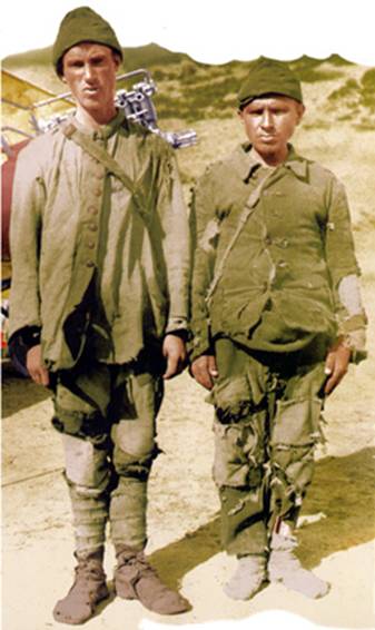 Uçağın varlığı ile anlayabildiğimiz, muhtemelen cephe gerisinde bir yer! Cepheye gitmeyen, ateş hattında bulunmayan, askerlerin(!) ayaklarında bot yok, çaput var. Yırtık pırtık giysiler. Hayret bir şey! Koskoca Osmanlı Devleti, cephe gerisinde hizmet edecek 2 askerini giydirmekten aciz duruma düşmüş! Uzun boylunun giymiş olduğu cekette düğmeler sol tarafta, halbuki Türk üniformasının düğmeleri sağ tarafta olur… Bu fotoğrafa Çanakkale’de savaşan Türk Askeri demek, olsa olsa karşı propaganda amacını taşır… Fotoğrafta görünen kişileri eleştirmiyorum, onlar yokluk içinde yaşayan ve üryanlıklarını örtmek için çöplüklerde bulduklarını giyenlerde olabilir, Allah rahmet etsin… Ancak bu fotoğrafı Türk Halk’ına, “Fedakar Kahramanlar” diye anlatmak Türk Askerlerine hakarettir!