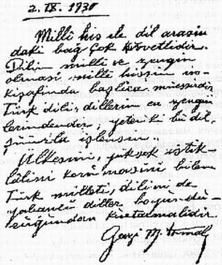 “Milli his ile dil arasındaki bağ çok kuvvetlidir. Dilin milli ve zengin olması milli hissin inkişafında başlıca müessirdir. Türk dili dillerin en zenginlerindendir; yeter ki bu dil şuurla işlensin. Ülkesini, yüksek istiklalini kurtarmasını bilen Türk milleti dilini de yabancı diller boyunduruğundan kurtarmalıdır.”