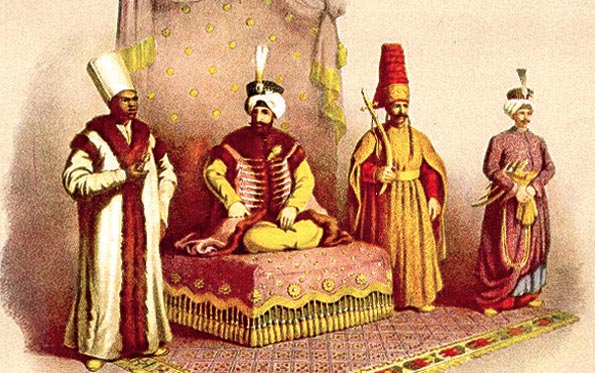 Sultan II. Mahmud Han’ın sağında Darüssaade Ağası. Solda Silahtar Ağa ve Başçuhadarın temsili resimleri.