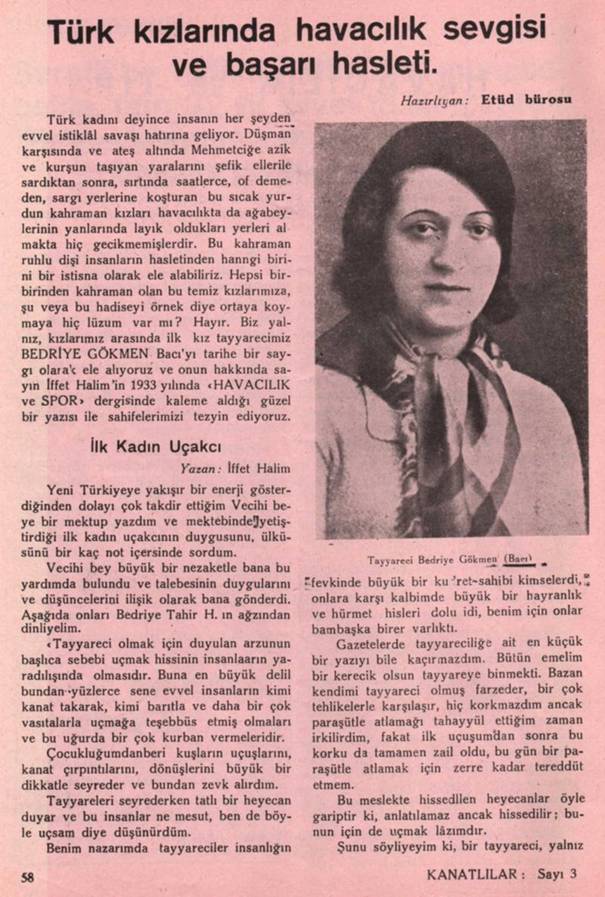 Sabiha Gökçen mi dediniz… Hayır. Gökçen, dünyanın ilk kadın savaş pilotudur ama Türkiye’nin ilk kadın pilotu değil.Geçen hafta ajanstan gelen bir haberdeki “Türkiye’nin ilk kadın pilotu Sabiha Gökçen” ifadesini görünce yazmak şart oldu. İlk kadın pilotumuz Bedriye Tahir Gökmen’dir. Çok az kişi bilir. Sabiha Gökçen’in şöhretinin yanında, hiç adı anılmayan Bedriye Tahir’in buruk bir hikayesi var. 1932 yılıydı, o dönemde Türkiye’de hiçbir kadının cesaret edemediği bir işe heves etti Bedriye Tahir. Uçmak istiyordu. Vecihi Sivil Uçuş Okulu’nun kapısından girdiğinde herkes çok şaşırdı. 12 erkek öğrenci vardı. Ancak Vecihi Hürkuş onu görünce çok sevindi, hemen kaydını yaptı.