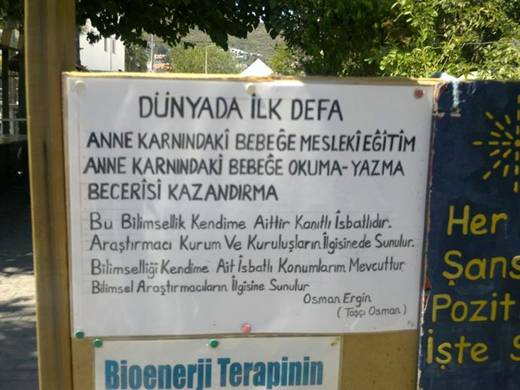 Türk, o kadar çok yeteneklidir ki; yazının başına koyduğum, fotoğraftaki yazıyı bir daha okuyunca bunu daha iyi anlarsınız.Lakabı Taşçı Osman olan bu kardeşimiz “anne karnındaki bebeğe mesleki eğitim ve okuma yazma becerisi kazandırmayı bilimsel olarak ispatladığını söylüyor.Var mısınız bu Türk’le ve onun milletiyle iddialaşmaya?