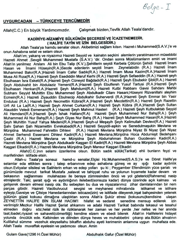 Kaşgar’daki tekkenin seceresinin Türkçesi