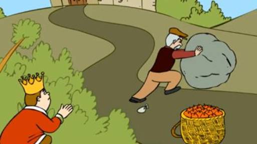 Sonunda bir köylü çıkageldi. Saraya meyve ve sebze getiriyordu. Sırtındaki küfeyi yere indirdi, iki eli ile kayaya sarıldı ve ıkına sıkına itmeye başladı. Sonunda kan ter içinde kaldı ama, kayayı da yolun kenarına çekti.