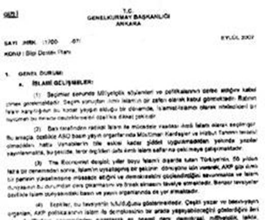 Radikal Gazetesi’nde tam metni yayınlanan Korgeneral Nusret Taşdeler’in adını taşıyan Eylül 2007 tarihli beş sayfalık belgede 22 Temmuz 2007 seçimleri sonrası Türkiye’nin durumuyla ilgili tespitler ve değerlendirmeler yer alıyor. Son sayfasında ‘Genelkurmay Başkanı’nın emriyle’ ibaresi bulunan belgede, 22 Temmuz seçimlerinin ‘Türkiye’nin ılımlı İslam’a dönüştürülmesi gayretleri bakımından milat olduğu’ öne sürülürken, Türk Silahlı Kuvvetleri’ne (TSK) duyulan güvenin de azaldığı vurgulanıyor.
