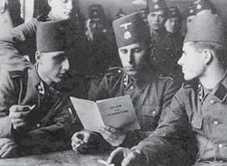 Nazi ordusuna katılan Müslüman askerler, Almanya’da Hüseyni’nin verdiği “İslam ve Yahudilik” kitabını okuyor.