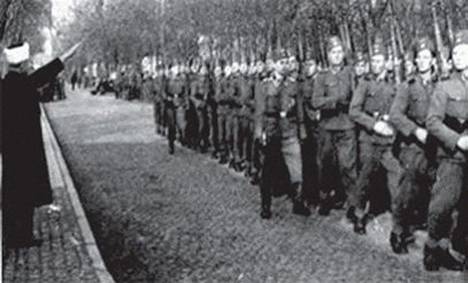 Hüseyni, Alman saflarında çarpışmak üzere cepheye giden Müslüman askerleri ”Heil Hitler” diye uğurluyor.