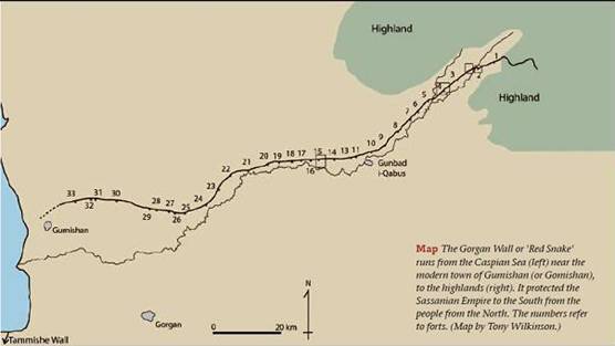 1999 yılında arkeologlar tarafından keşfedilen ve daha sonra İngiltere-İran ortak kazılarıyla gün yüzüne 2005 yılında çıkartılan sed, pişmiş tuğladan yapıldığı için Kızıl Yılan adıyla anılıyor. Bu dev duvarın bir başka adı da Gorgan Seddi. (duvarın biraz gerisinde ki yerleşim yerinin adı) Bir ucu Hazar denizinden başlayan seddin diğer ucu Elbruz Dağlarının kayalık kısımlarında son buluyor. 195 km uzunluğundaki duvarı birde 5 metre genişliliğinde bir su hendeği koruyordu. Ayrıca duvar üstünde belirli aralıklarla 30.000 askerin barınabileceği küçük kaleler mevcuttu. Örneğin, duvarın üzerinde ki kalelerden biri 5.5 hektar alanı kaplayacak kadar büyüktü. Arkeologlar duvarın inşası için kullanılan pek çok tuğla ocağı ortaya çıkarttılar. Ocaklar duvara 20 ila 100 metre uzaklıktaydı ve duvarın inşası için kullanıldıkları açıktı. Ocaklar da kilden yapılmış tuğlaları pişirmek için kullanılan yakılan ağaç parçalarının üzerinde uygulanan Radyo karbon tekniği ile duvarın MS 5. veya 6. Yüzyıllarda inşa edildiği ortaya çıkartıldı.